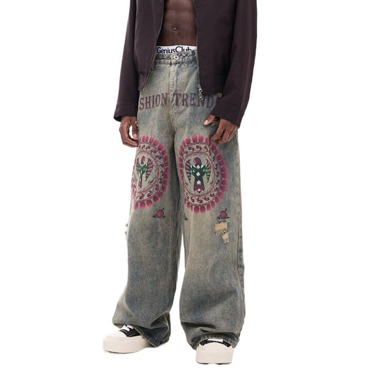 Eagle Print Distressed Wide - Leg Denim Jeans