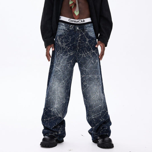 Lightning Pattern Rhinestone Wide-Leg Jeans