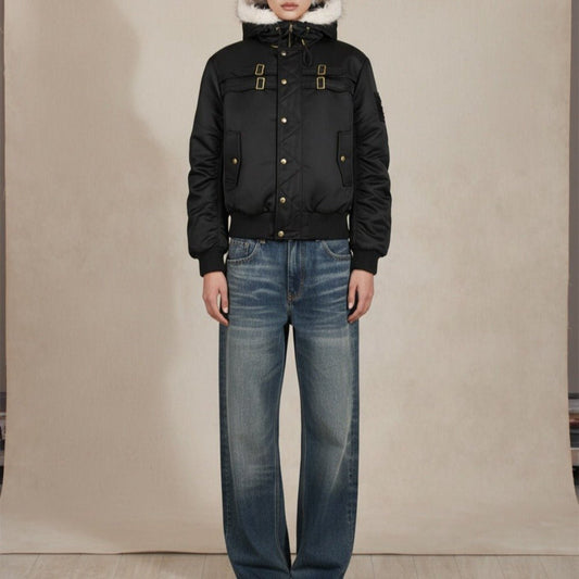Vintage Washed Faux Fur Hooded Bomber Jacket