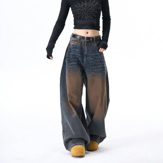 Retro Gradient Rhinestone Wide-Leg Jeans